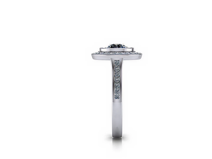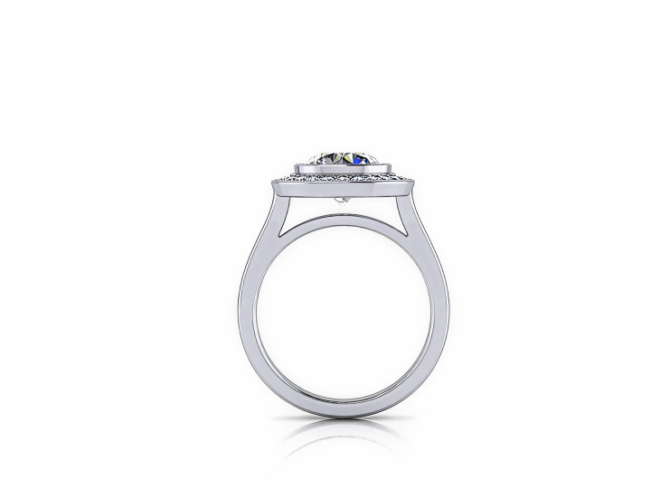 A refined bezel-set center framed by a delicate pavé halo, designed for modern brilliance with a clean, architectural silhouette.