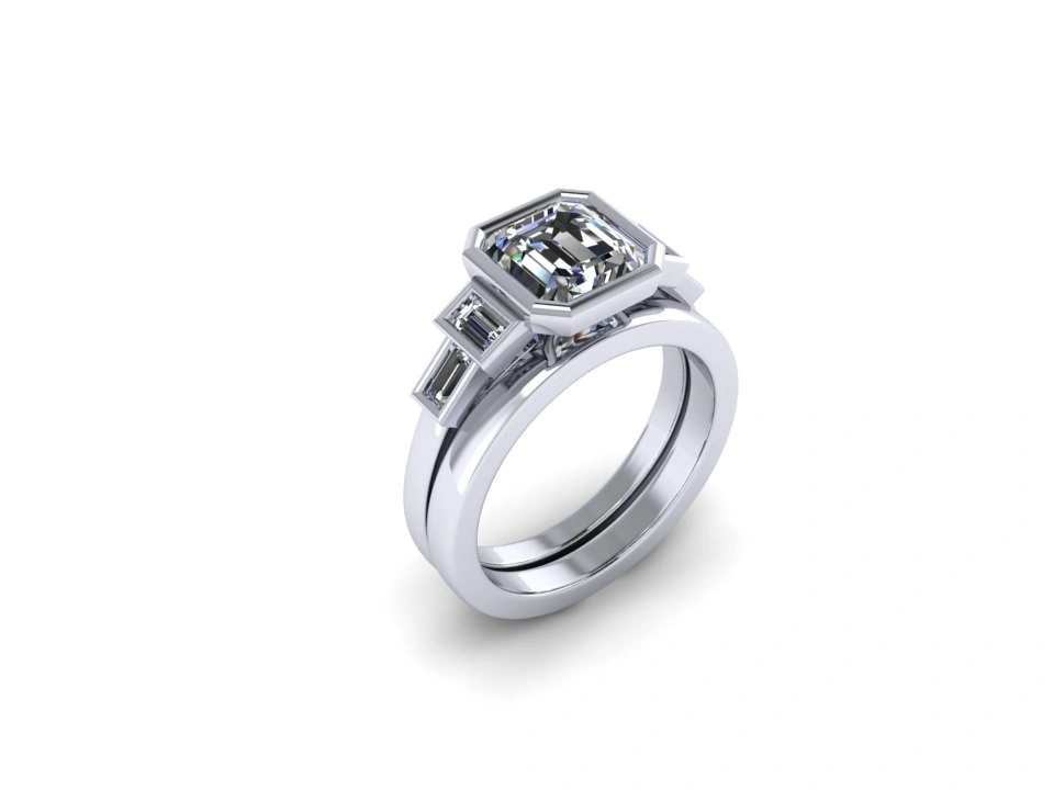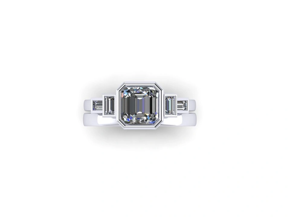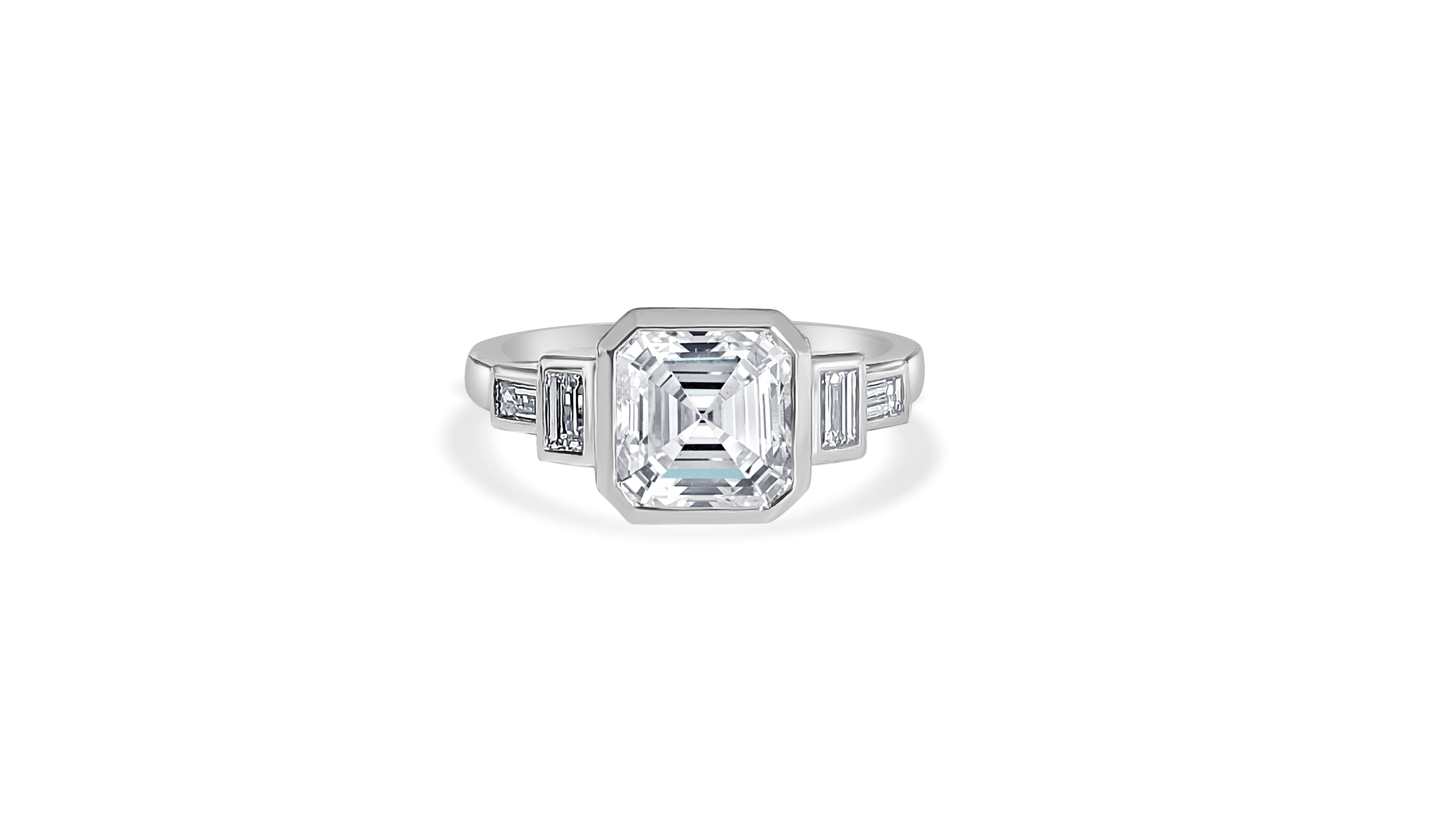 A bold bezel-set center with step-cut side stones, defined by clean geometry and structured brilliance.