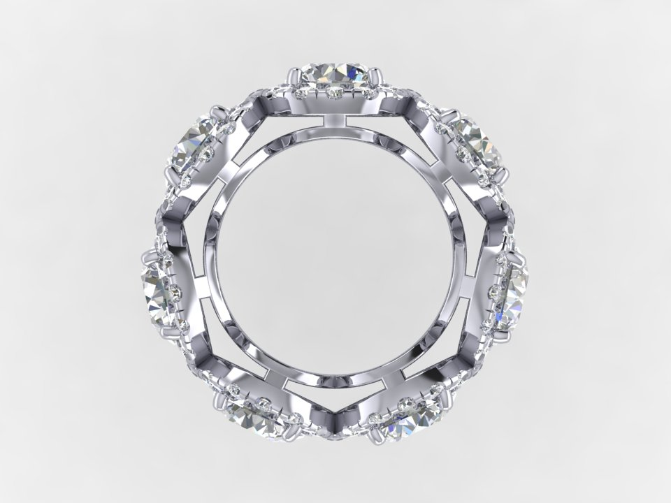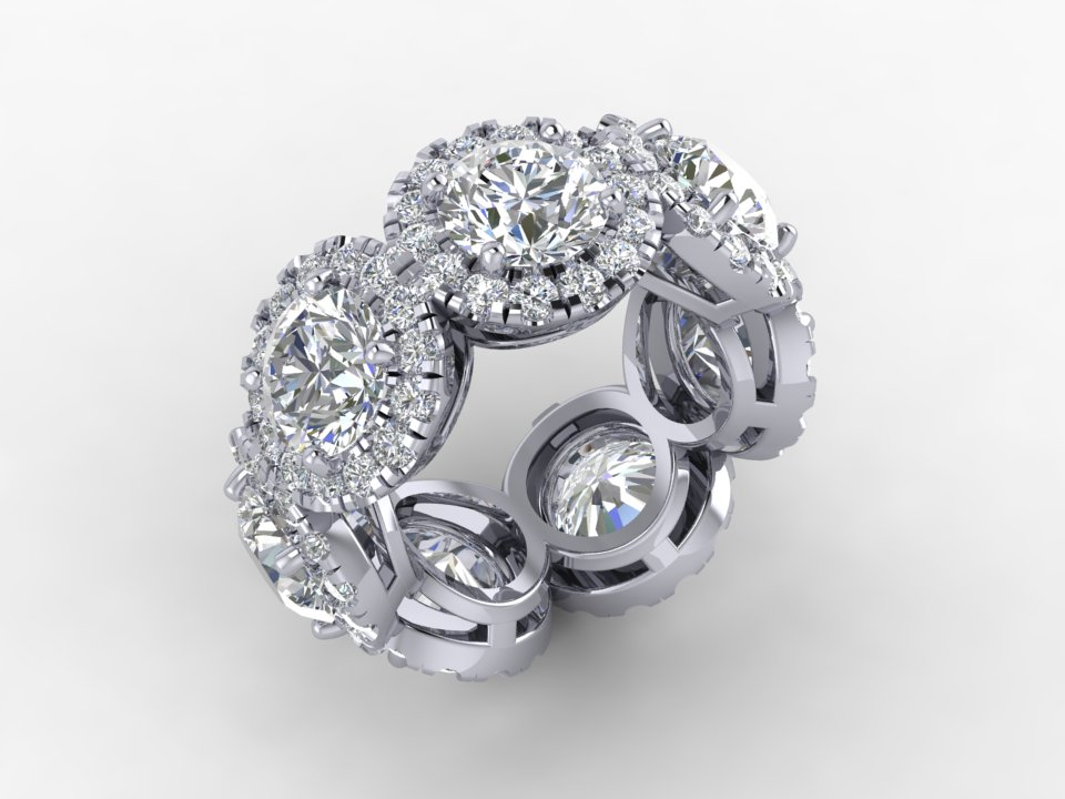 A bold eternity-style ring featuring round brilliant diamonds framed by radiant halo settings.