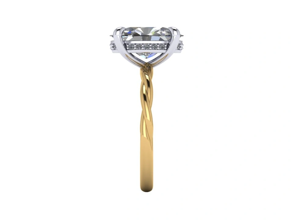 The Twisty Ring by ADCO Diamond features a brilliant oval-cut center stone secured in a refined prong setting, designed to maximize light and showcase the diamond’s elongated sparkle. Beneath the center stone, a discreet row of pavé diamonds adds an extra layer of brilliance, creating subtle light reflection from every angle. The band is crafted in a graceful twisted design in polished yellow gold, bringing fluid movement and sculptural character to the ring. This gentle intertwining form contrasts beautifully with the crisp white metal setting that holds the center diamond, creating a balanced composition of warmth, brilliance, and modern sophistication.