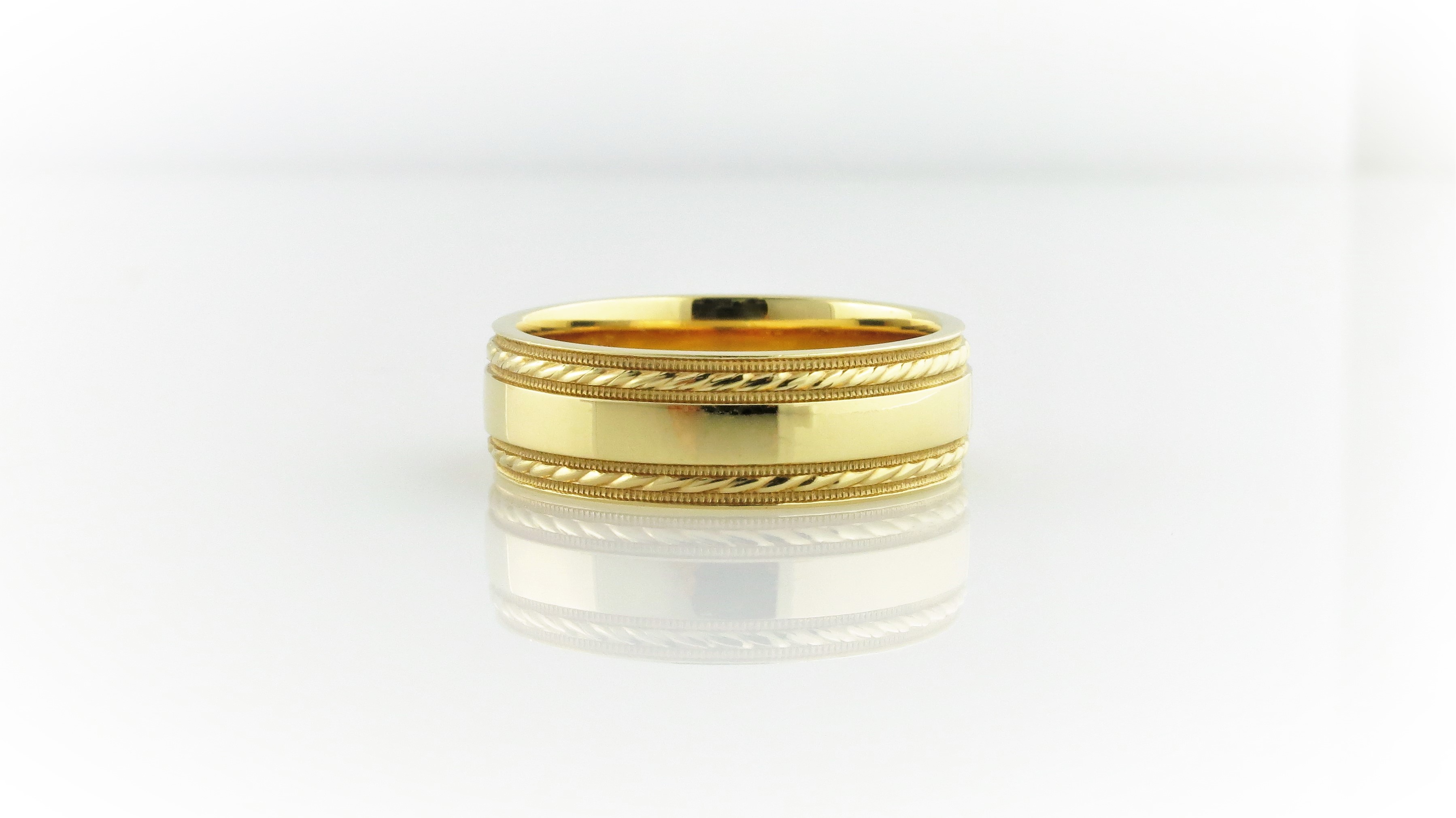 7mm polished comfort fit wedding band with swirl design and milligrain eges. Size 10.