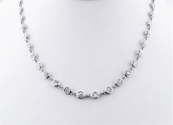 Stunning 14kt white gold necklace with 49 bezel set round brilliant cut diamonds, total weight 10.00 carats. 18″ length.